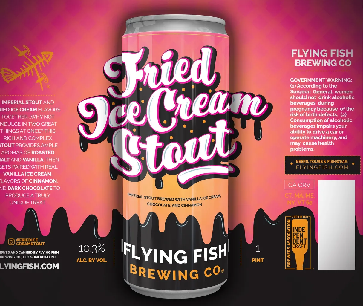 Flying Fish Fried Ice Cream Stout er en 10,3 % ABV Imperial Stout med begrenset utgivelse, en ikke-skje-påkrevd nytelse med aromaer av stekt malt og vanilje med smaker av ekte vaniljeis kanel og mørk sjokolade.