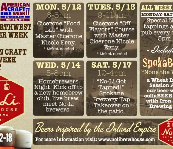 Spokane WA... No-Li Brewhouse vil feire American Craft Beer Week (ACBW) Seattle Beer Week og tidenes første Inland NW Craft Beer Week (INWBW) med arrangementer i hele Pacific Northwest fra 12. mai – 18. mai 2014.
